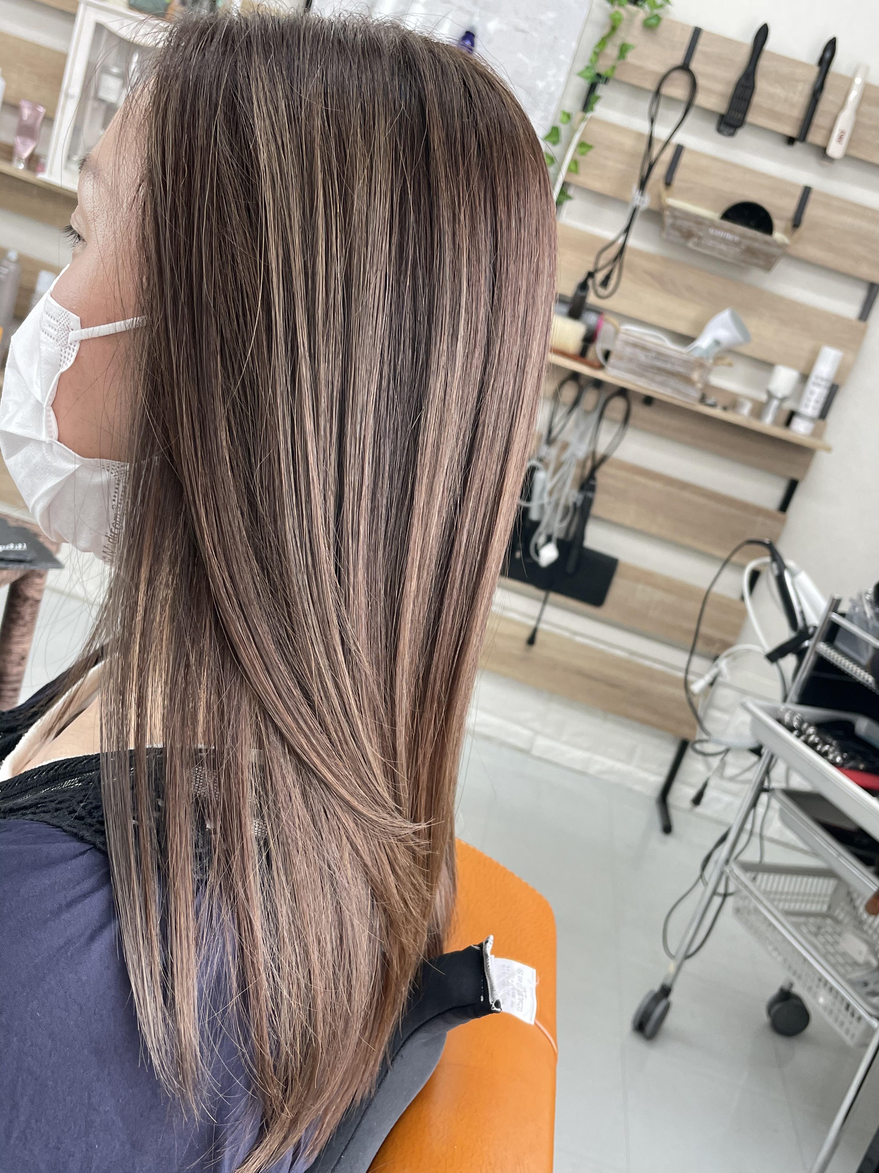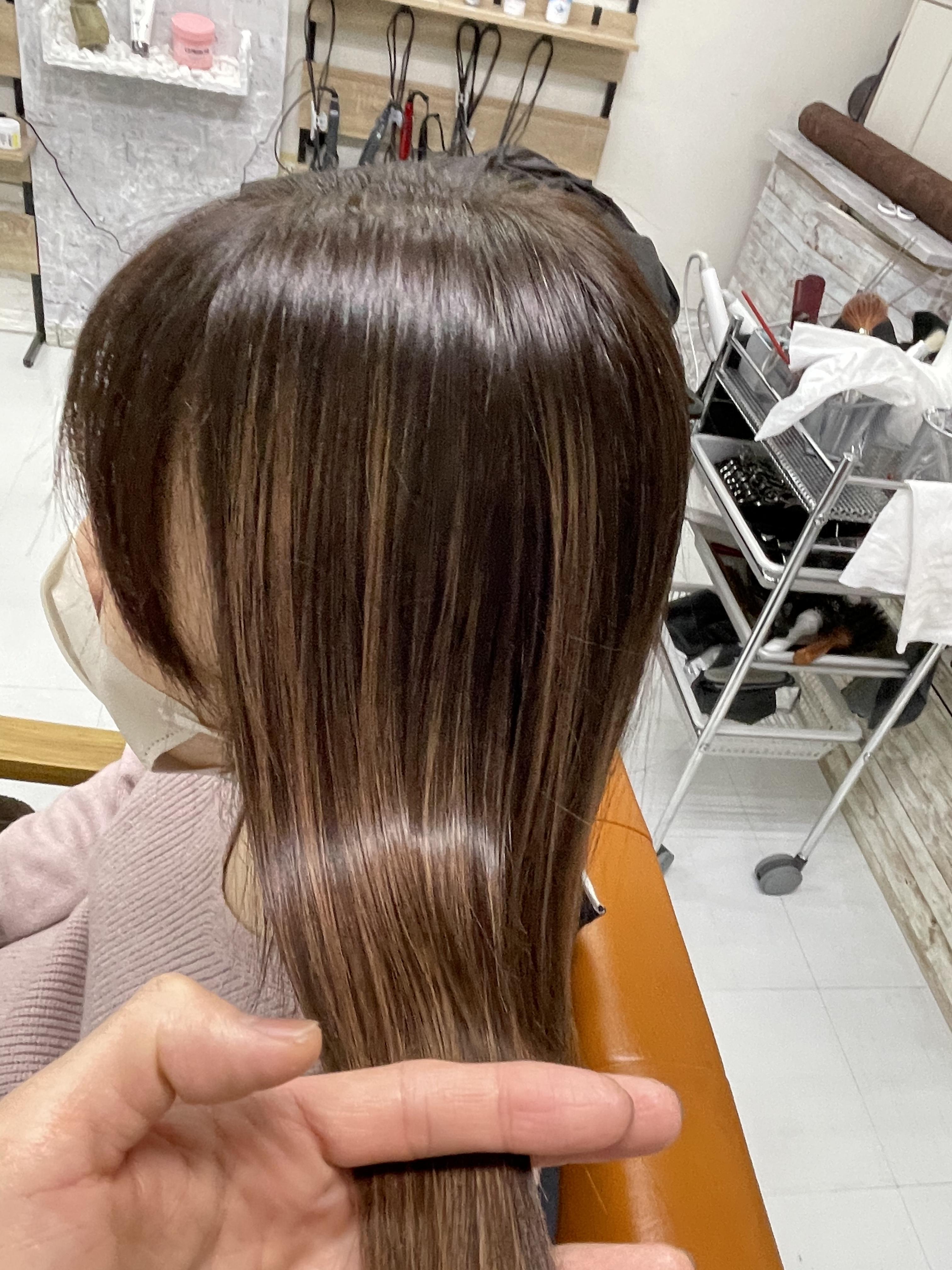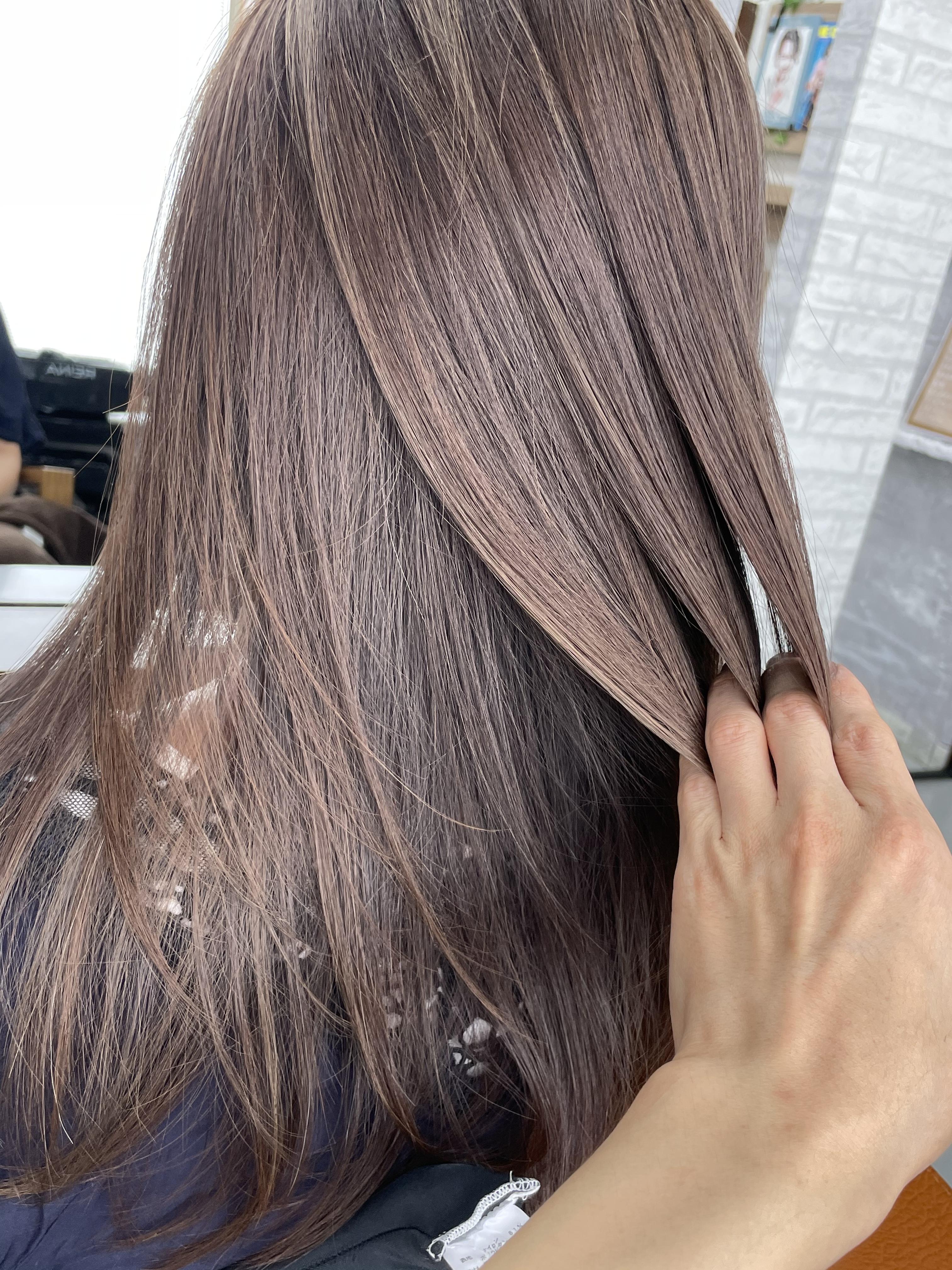 トリートメントで毛髪を守りながら染めていきます 色持ちや、切れ毛を防ぎます